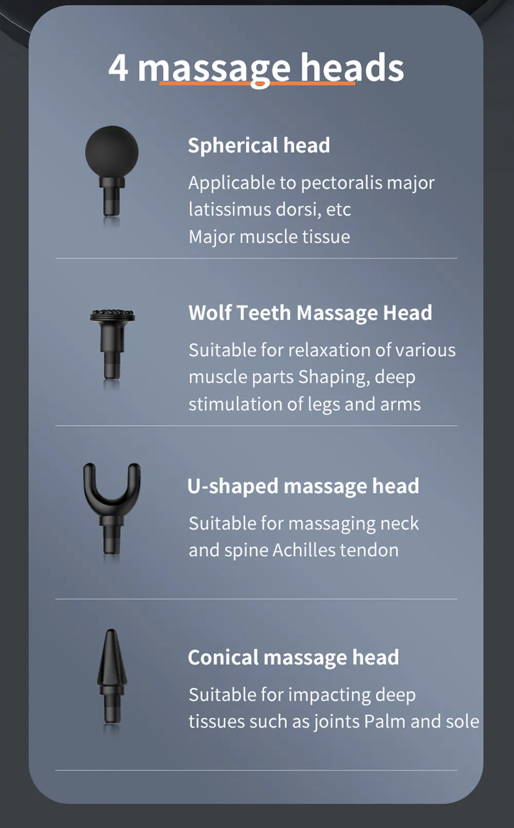 【Multifunctional Massage 】: The deep tissue massage has 4 different massage heads, each of which is aimed at different muscles. After the massage hits the muscles, it can promote blood circulation, decompose lactic acid, and relieve muscle soreness after exercise.